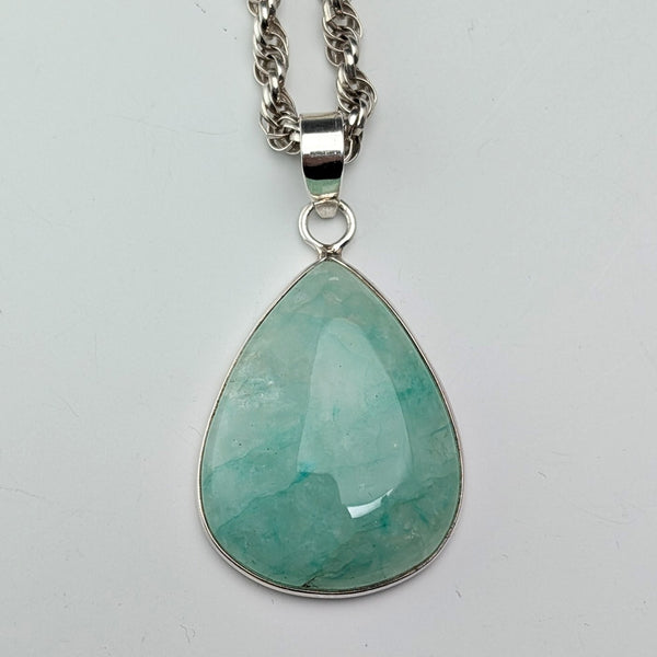 ヴィンテージのペンダントをご紹介いたします。純銀製の土台に大きめの楕円形の薄いグリーンが美しい涙滴状のアマゾナイト(天河石)のペンダントです。螺旋状の凝った造りの純銀製ネックレスチェーンが付属します。この「一期一会」があなたの特別な出会いになることを願っています!【コンディション】外観:★★★★☆ 目立った傷や汚れのない美品・経年の摩耗や汚れはありますが目立つ傷もなく美しい状態です・ペンダントのバチカン部分に「925」の刻印があります・チェーン金具に英国の純銀のホールマークがあります ※古いものですので経年による細かな傷や汚れはございます ※写真をご確認いただきご了承のうえ購入をお願い致します【詳細】・メーカー 不明・製造年 1985年(チェーン)・材質 石:アマゾナイト(天河石) 台座:スターリングシルバー(925/1000) チェーン:スターリングシルバー(925/1000)・サイズ ペンダント:縦43 x 幅28 x 厚み8mm チェーン:長さ60cm 太さ4mm・重量 ペンダント 12.5g チェーン 17.8g ※不明な点がありましたらなんでもお気軽にご質問ください