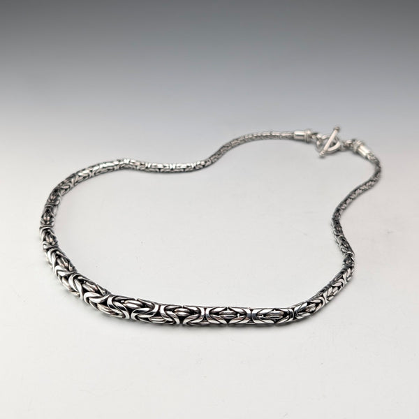 英国製の純銀製ネックレスをご紹介いたします。2007年製と比較的新しい、英国DK社製の純銀製ネックレスです。ビザンチンチェーンと呼ばれる丸カンを編んで作られた複雑な造りのチェーンです。中心付近が太くなっているタイプです。留め金はTバーを輪っかに入れるタイプとなっています。この「一期一会」があなたの特別な出会いになることを願っています!【コンディション】外観:★★★★☆ 目立った傷や汚れのない美品 機能:★★★★☆ わずかな劣化はあるがほとんど問題ない・経年の摩耗や汚れはありますが目立つ傷はなく美しい状態です・留め金の引き輪部分に英国のシルバーのホールマークがあります ※古いものですので経年による細かな傷や汚れはございます ※写真をを確認しご了承のうえで購入をお願い致します【詳細】・メーカー DK・製造年 2007年(バーミンガムh)・材質 スターリングシルバー(925/1000)・サイズ 全長46.5cm・重量 54g ※アンティーク品ですので全く同じものは他にありません※不明な点がありましたらなんでもお気軽にご質問ください