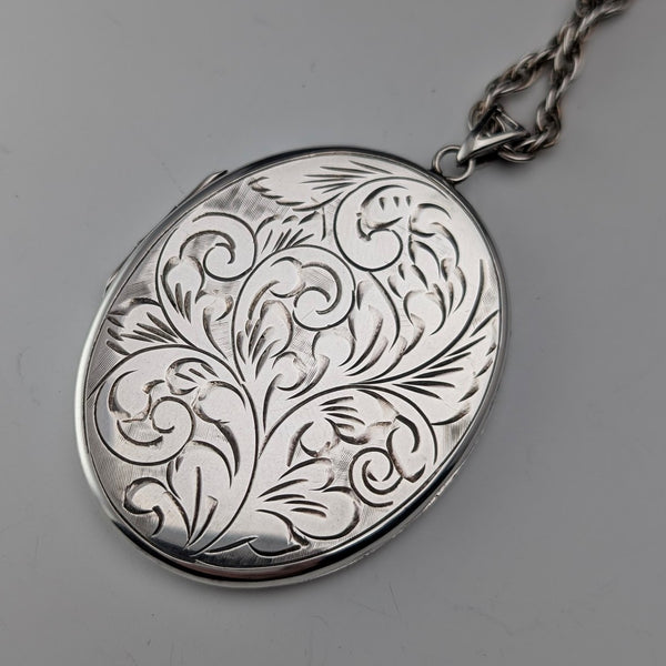 英国ヴィンテージのロケットペンダントをご紹介いたします。1975年 英国バーミンガム「Nathan Brothers」の作品です。中に小さな写真などを入れておく純銀製のロケットペンダントです。ロケットペンダントしてはかなり大型で、蓋には植物のスクロール装飾が施されています。販売ジュエラーの紙箱と純銀製のダブルリンクチェーンが付属します。この「一期一会」があなたの特別な出会いになることを願っています!【コンディション】外観:★★★★☆ 目立った傷や汚れのない美品・経年の摩耗や汚れはありますが目立つ傷もなく美しい状態です・ロケットの開閉はスムーズでしっかりと閉まります・ロケットには英国の純銀のホールマークが刻印されています・チェーンには刻印が見当たりませんが純銀製であることがテストされています ※古いものですので経年による細かな傷や汚れはございます ※写真をご確認いただきご了承のうえ購入をお願い致します【詳細】・メーカー Nathan Brothers・製造年 1975年(バーミンガムA)・材質 ペンダント:スターリングシルバー(925/1000) チェーン:スターリングシルバー(925/1000)・サイズ ロケット:縦49 x 幅40 x 厚み4mm チェーン:長さ55cm 太さ3mm・重量 ペンダント 19.2g チェーン 10.4g ※不明な点がありましたらなんでもお気軽にご質問ください