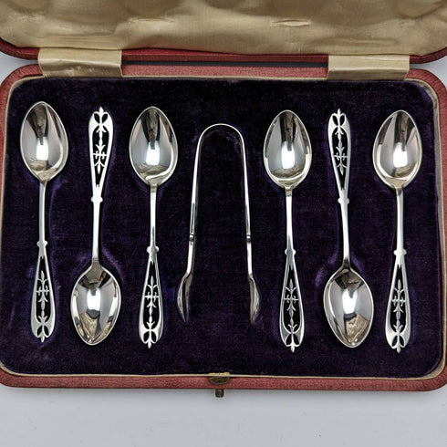 1907年 英国アンティーク 純銀製ティースプーン6本&シュガートングセット ケース入り James Dixon