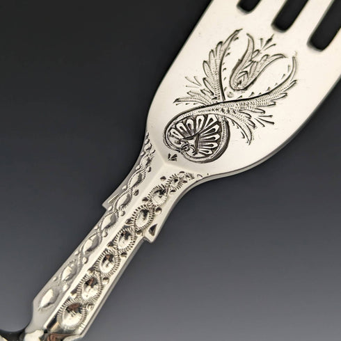 純銀製のブレードには魚とスクロールによるとても美しい彫刻が施されています。