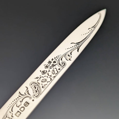 純銀製のブレードには花とスクロールの美しい彫刻が施されています。
