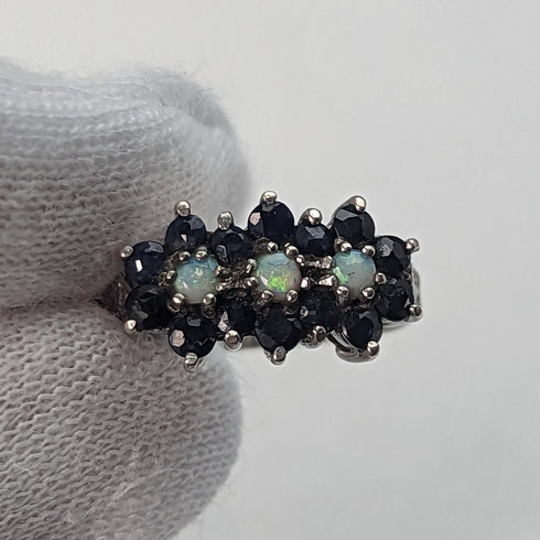 英国ヴィンテージジュエリー ダークブルーストーン&オパール3連フラワー シルバーリング(8-9号) 指輪