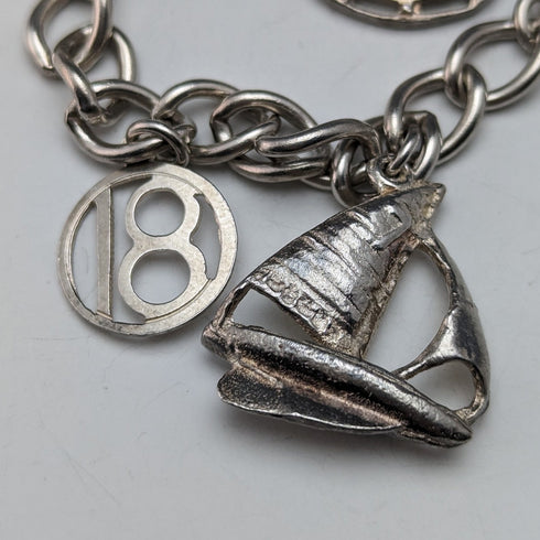 ヨットやブーツなど8個のシルバー製のチャームがチェーンに取り付けられたブレスレットです。