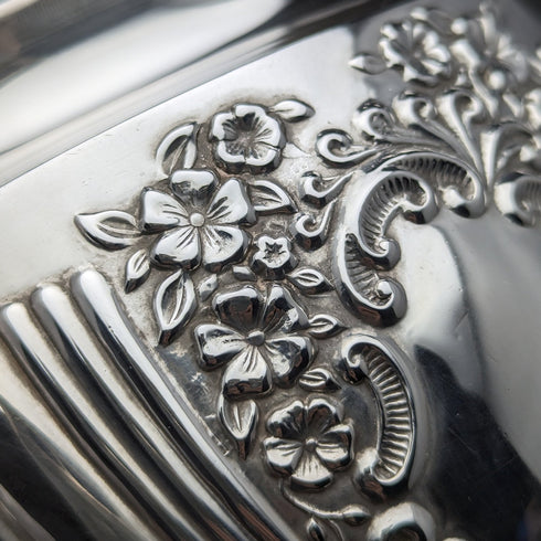 小花とカルトゥーシュの打ち出し装飾が見事でコンディションもかなり良好です。