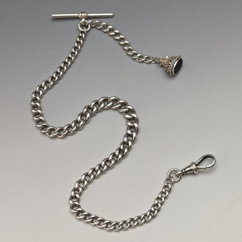 1902年頃 英国アンティーク 純銀製アルバートチェーン 39g ブラックオニキスシールフォブ