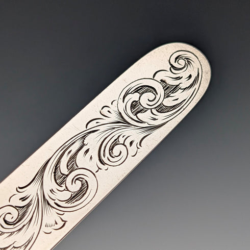 ハンドルは経年の汚れや傷はありますが花の浮彫装飾が美しく、ブレードにも美しい装飾が施されています。