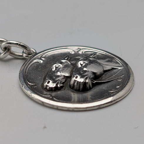 馬の頭が立体的に浮き彫り彫刻されたコイン型の純銀製フォブが付属します。