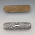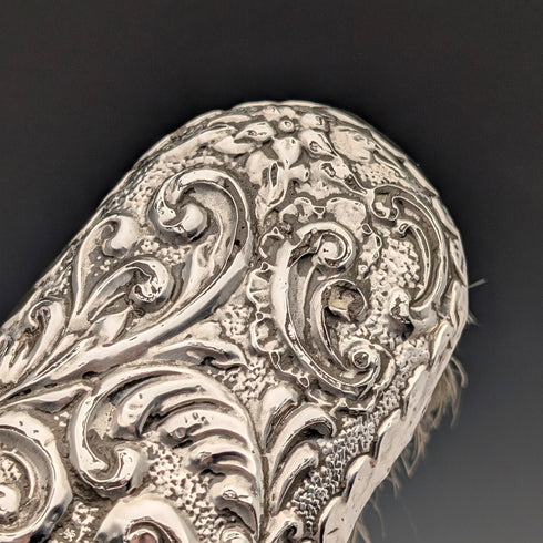 アンティークらしいスクロールと小花の浮き彫り装飾の、純銀製の土台のブラシのペアです。