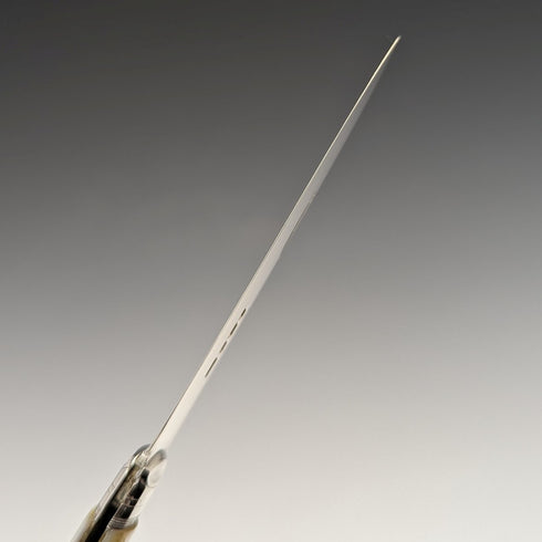它是折疊式的,帶有白色珍珠手柄和純銀刀片。