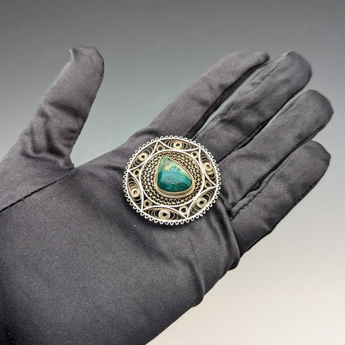 由被稱為“花絲”的細銀絲和天然石材製成的胸針。